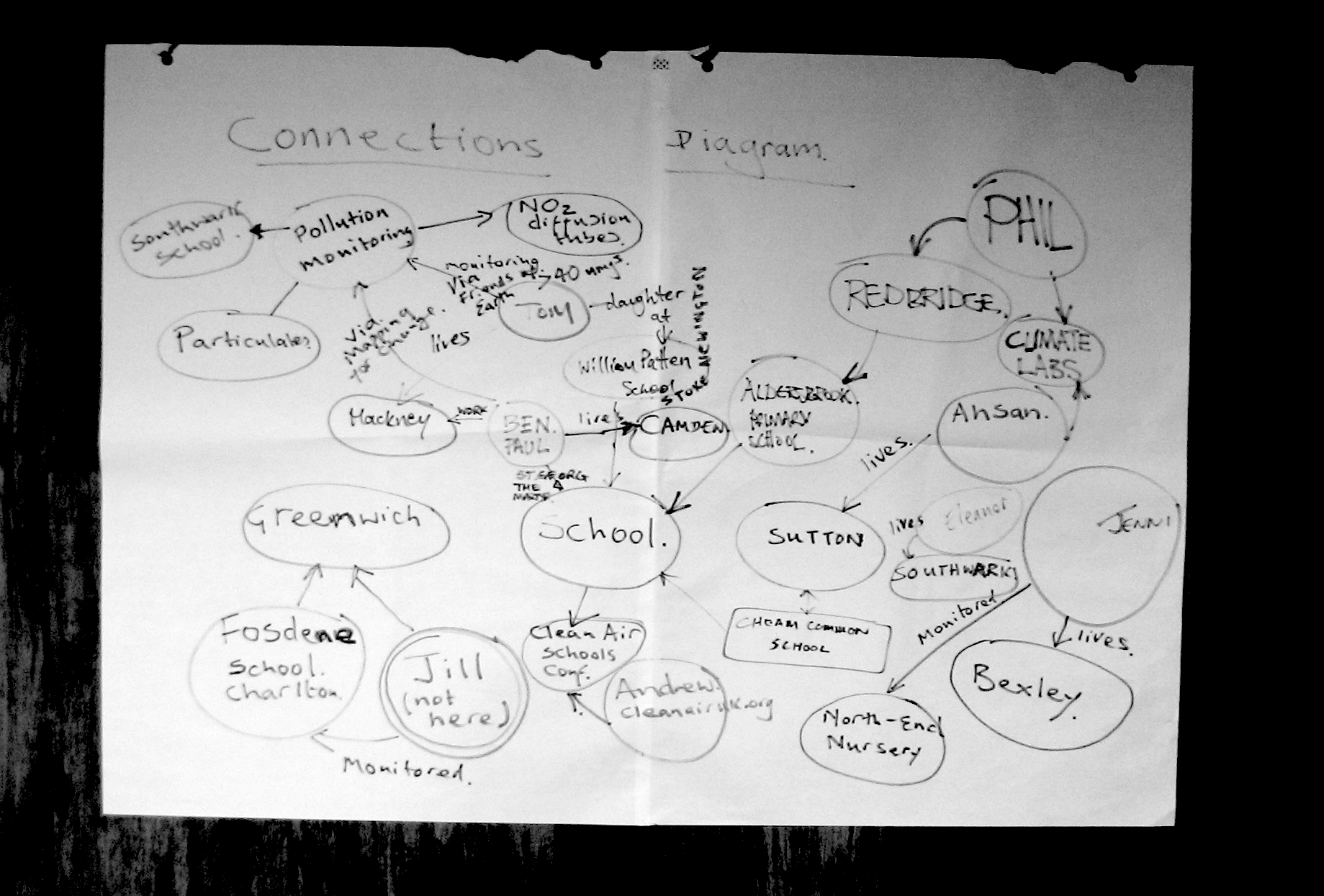 We created a diagram showing the connections of the attendees at the Clean Air Schools gathering, Sept 2017 [detail shown].
